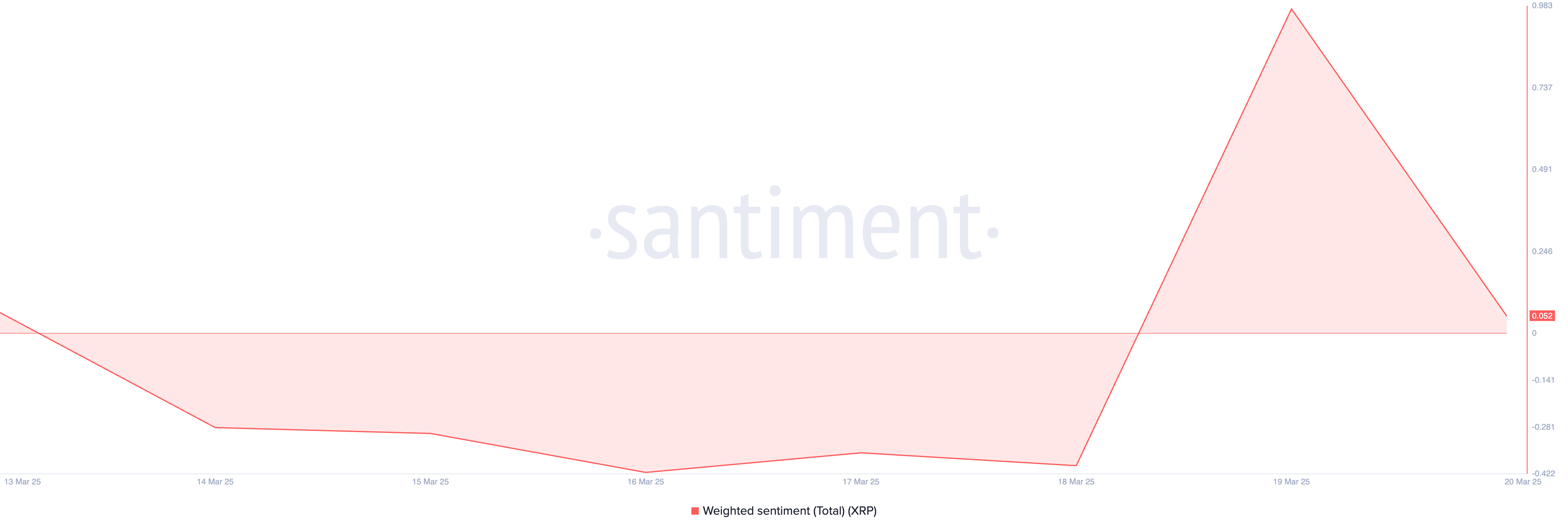 SponsoredAdemás, el sentimiento ponderado decreciente del token refleja la presión bajista en el mercado de XRP. Al momento de la publicación, está a punto de romper por debajo de la línea central en 0.052.