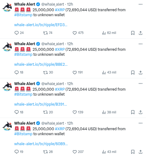 El flujo de grandes cantidades de XRP hacia direcciones privadas llamó la atención de analistas y traders. Según Whale Alert, 4 transferencias de 25 millones de tokens cada una se realizaron desde la plataforma Bitstamp, sumando un total de 100 millones de XRP, equivalentes a casi 300 millones de dólares.