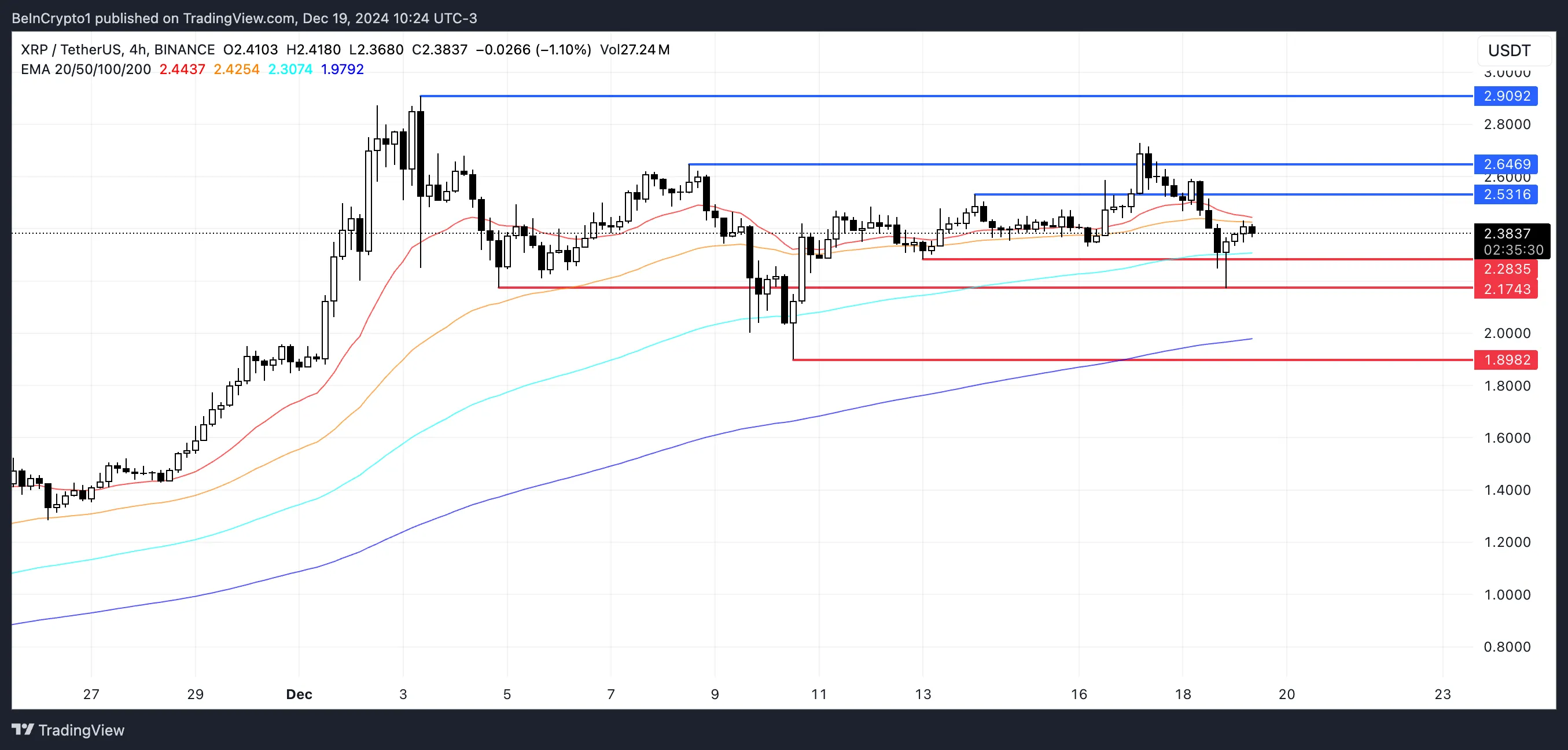 XRP se está negociando actualmente entre 2,28 dólares y 2,53 dólares, con el soporte en 2,28 dólares actuando como un nivel crítico. Si este soporte falla, el precio de XRP podría disminuir aún más para probar 2,17 dólares. Con ello, potencialmente caer a 1,89 dólares, señalando una corrección más fuerte.