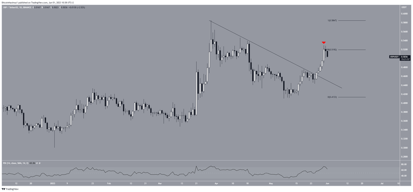 A pesar de la ruptura, el precio fue rechazado por el nivel de resistencia de retroceso de Fibonacci de 0.618 en 0.52 dólares (icono rojo). Ha caído desde entonces.