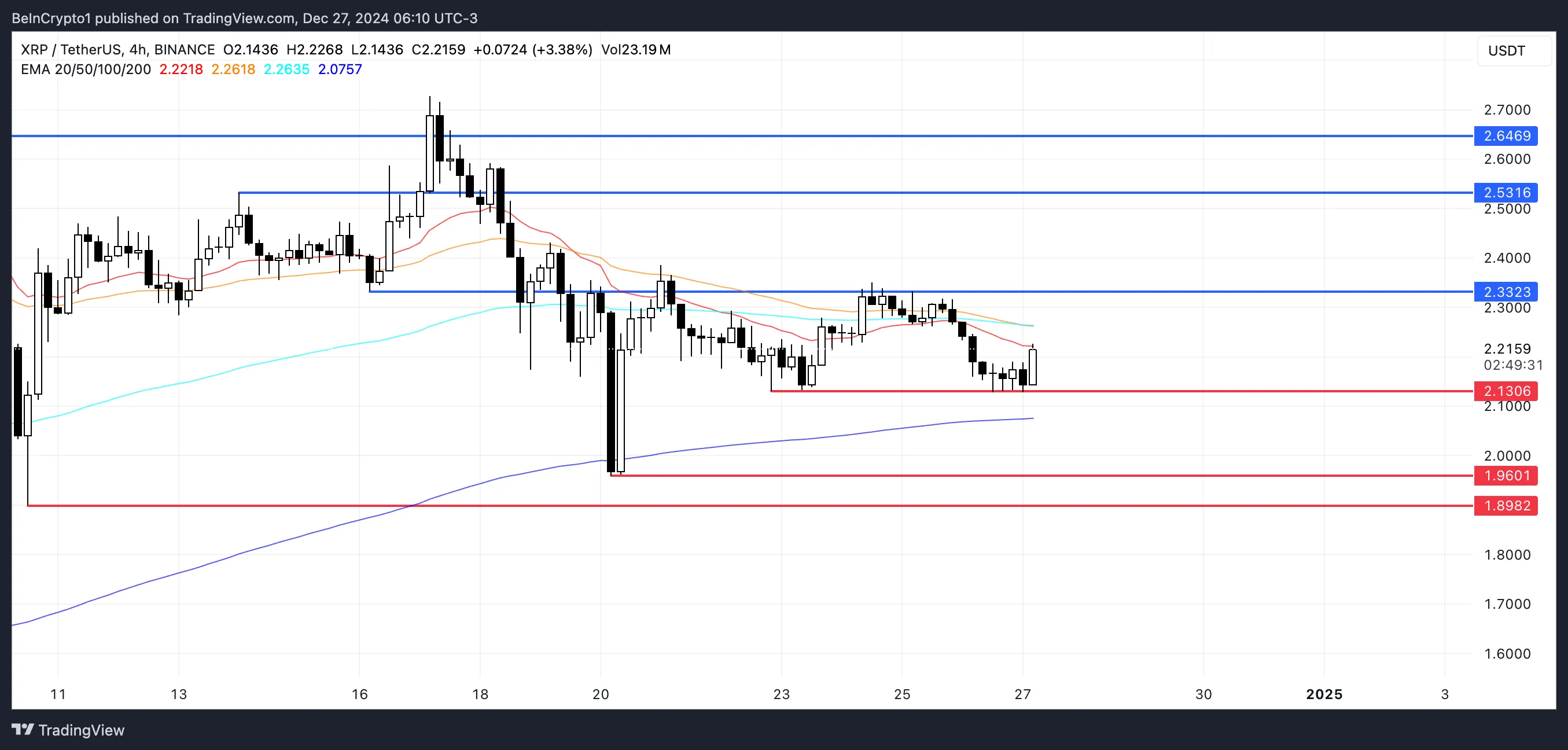 El precio de XRP recientemente probó el nivel de soporte en 2,13 dólares y logró mantenerlo, lo que llevó a un ligero rebote del precio. Aunque el token no ha entrado en una clara tendencia alcista, un mayor impulso al alza podría verlo probando la resistencia en 2,33 dólares.