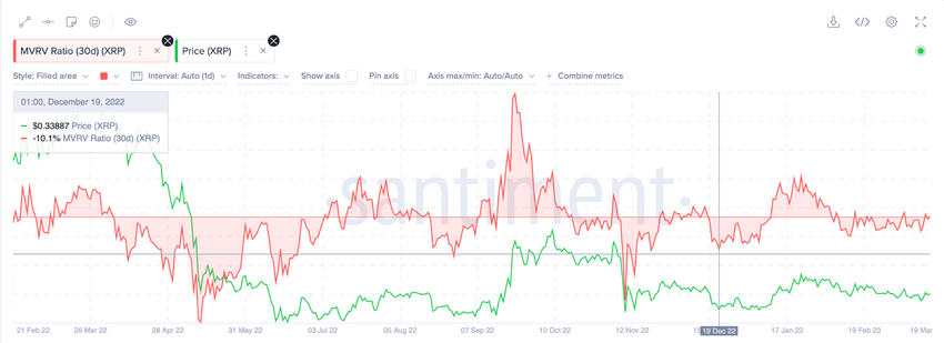 La métrica Market-Value-to-Realized-Value (MVRV) proporciona datos relevantes para las próximas acciones de precios de XRP. La mayoría de los holders que compraron XRP en los últimos 30 días tienen casi un 5% de pérdidas no realizadas.