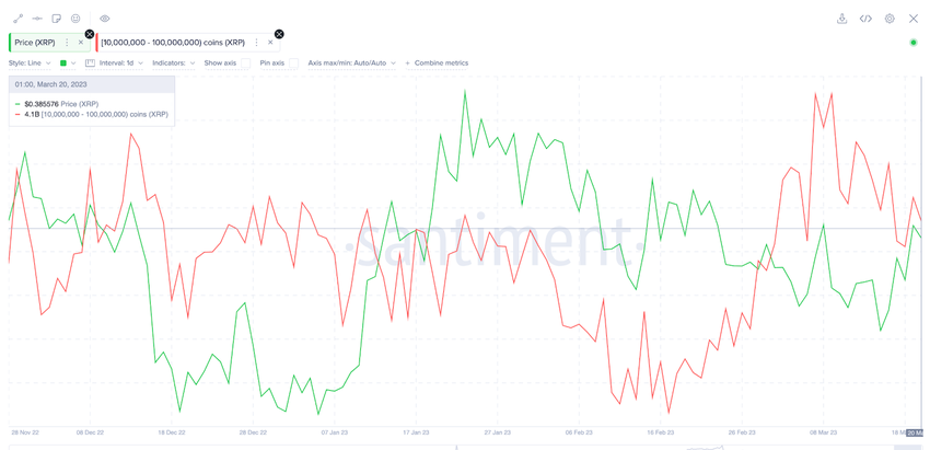 Las ballenas con saldos de 10 millones a 100 millones de XRP han vendido 30 mil millones de XRP por un valor aproximado de 11 millones de dólares. Entre el 9 y el 20 de marzo, este grupo de ballenas vio disminuir sus tenencias de 4,420 millones a 4,100 millones de tokens XRP.