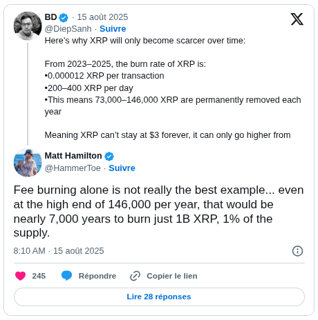 El ritmo actual es de unos 600 XRP quemados al día, muy lejos de los 2,700 de antes. En 13 años, apenas se han quemado 14,19 millones de XRP, es decir, el 0.014% de la oferta inicial de 100,000 millones. A este ritmo, harían falta más de 1.000 años para quemar 1 mil millones de tokens, ni siquiera el 1% del total.