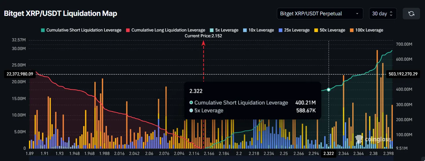 El mapa de liquidación muestra que una cantidad significativa de posiciones cortas, alrededor de 400 millones de dólares, están en riesgo de liquidación si el precio de XRP sube a 2,32 dólares. Sin embargo, incluso con XRP negociándose a 2.15 dólares, solo 8% por debajo del umbral de 2,32 dólares, el potencial de liquidaciones no parece inminente.