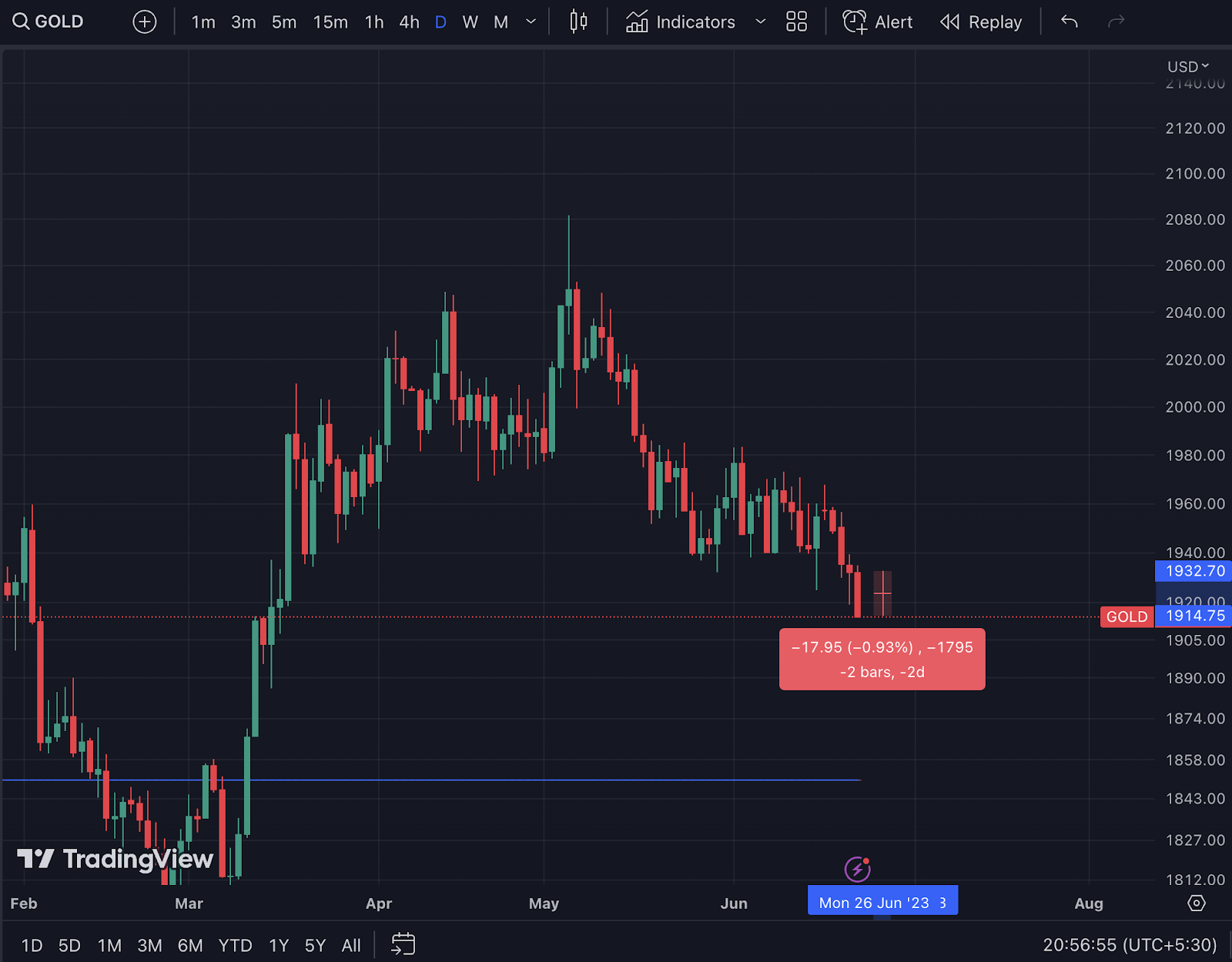 Hoy, el oro ha caído casi 1%. Si bien su precio ha entrado claramente en una tendencia bajista, formando máximos y mínimos más bajos.