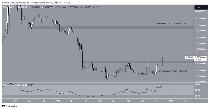 El precio de Bancor (BNT) se había negociado por debajo del área de resistencia horizontal de 0.65 dólares desde mayo de 2022. Durante este tiempo, realizó varios intentos fallidos de ruptura.