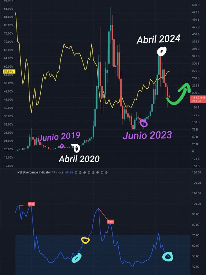 Sponsored“En el RSI podemos observar que actualmente las altcoins se encuentran sobrevendidas y muy cerca de un soporte forjado en 2019-2020 (círculo celeste). La subida en el ciclo anterior se inició partiendo de un RSI por encima de la zona actual (círculo amarillo). Con la mayoría de altcoins dibujando gráficas en fases de acumulación, invertir en este momento se convierte en una decisión inteligente, detalló CryptoEstigma”.