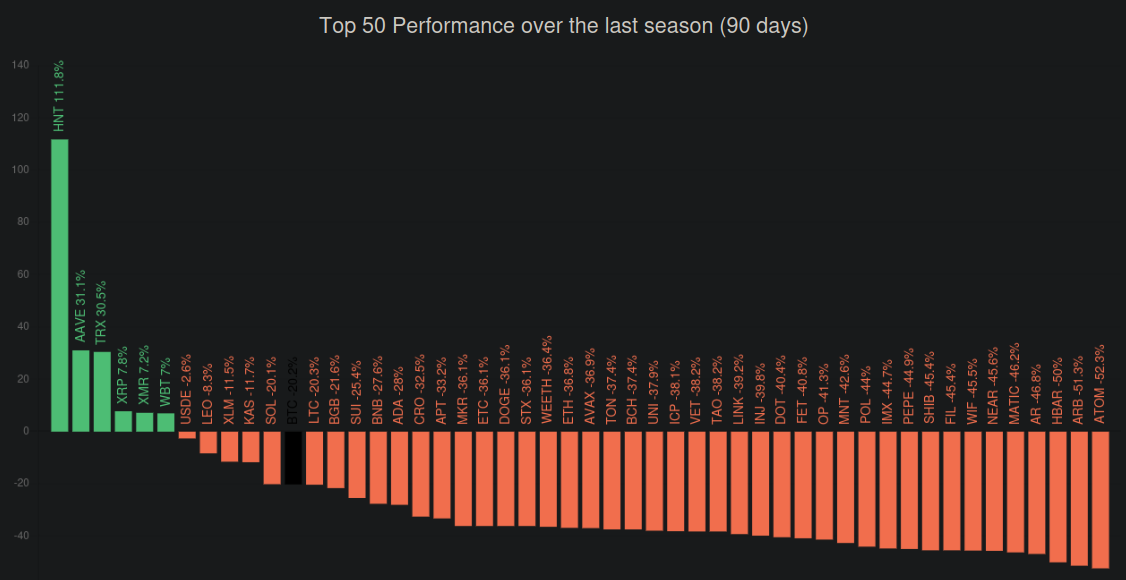 La altseason solamente comenzará cuando el 75% de las 50 principales altcoins tengan mejores resultados que Bitcoin durante 90 días. Sin embargo, a momento de la publicación este objetivo parece muy lejano, según datos de Blockchaincenter.