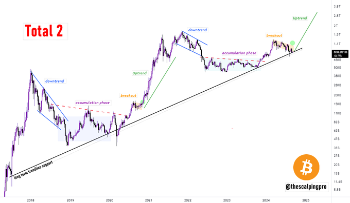 Por otra parte, @thescalpingpro también compartió su optimismo sobre las perspectivas a largo plazo para las altcoins. El analista compartió un gráfico de TOTAL2, el cual toma como base para pronosticar que se avecina la altseason “más grande de todos los tiempos”.