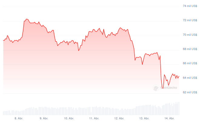 Al momento de la publicación, el precio de Bitcoin cotiza en 64,392 tras caer aproximadamente 4.6% en las última jornada y acumula pérdidas de 7.2% en la última semana.