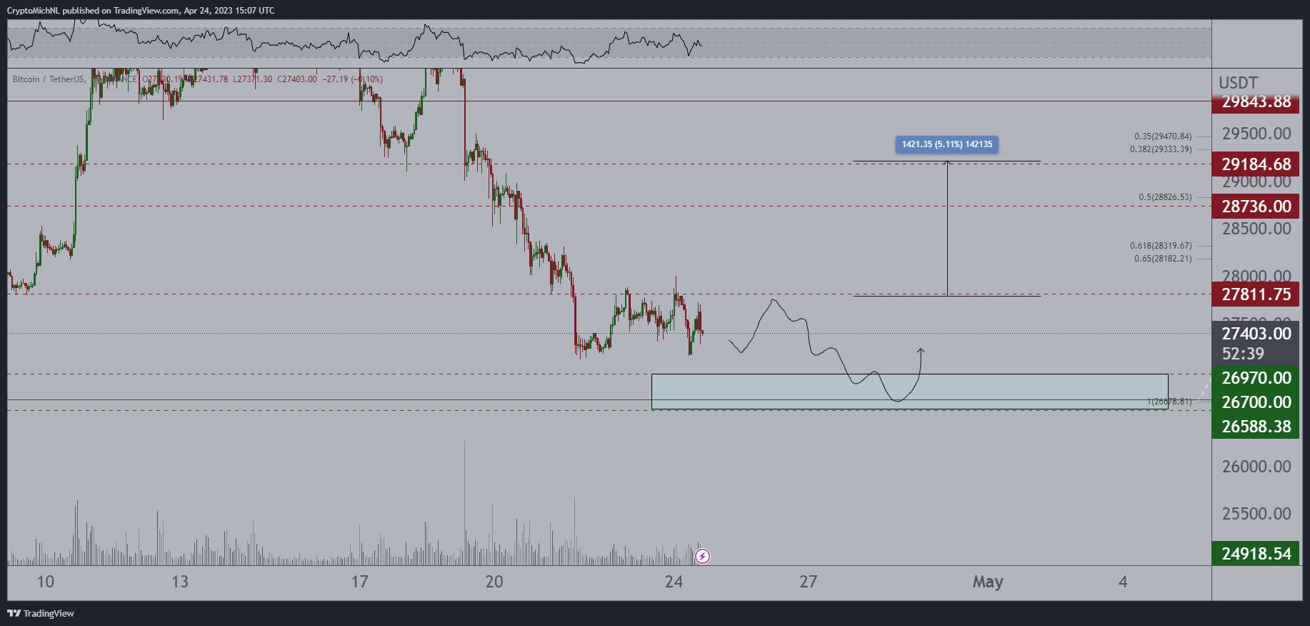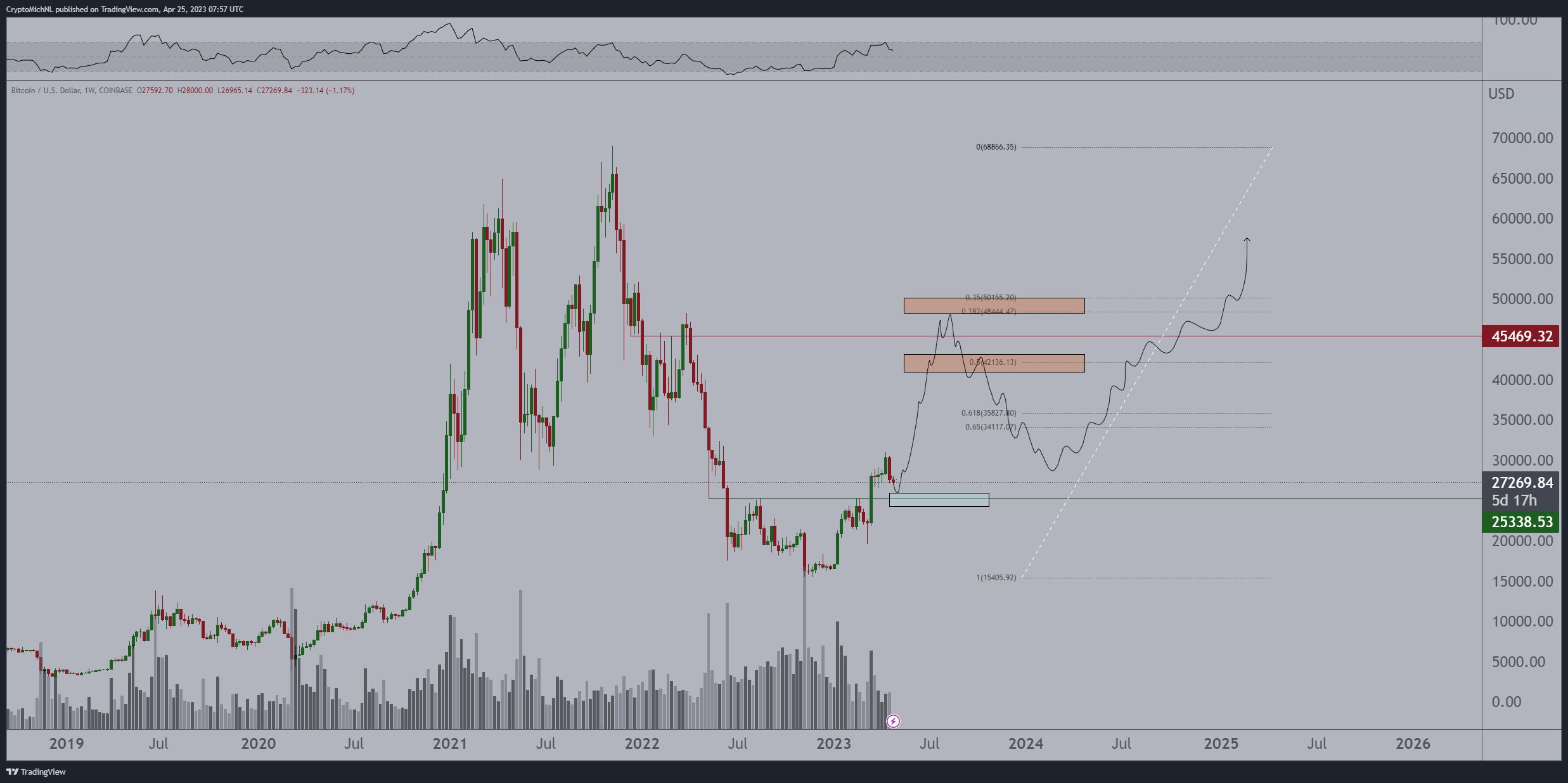 “Bitcoin buscará un nivel que debemos mantener. En ese caso, debemos considerar cualquier valor entre 26,600 y 28,000 como posibles zonas de entrada. Esos necesitan sostenerse a sí mismos. Si lo hacemos, podemos simplemente continuar (la tendencia alcista), y saben que los mercados toman tiempo antes de que se recuperen nuevamente”.