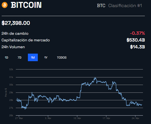 Al momento de la publicación, Bitcoin cotiza en 27,398 dólares, según los datos de BeInCrypto. De Igual forma, su capitalización de mercado ha registrado una caída considerable y se ubica en 530,4 mil millones de dólares.