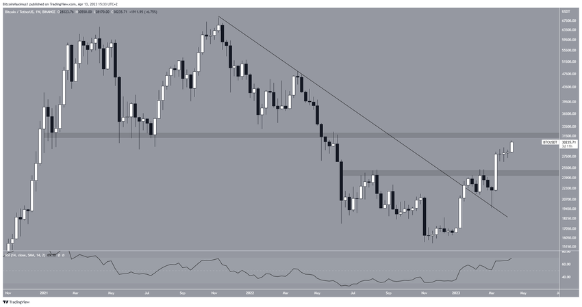 El precio de Bitcoin (BTC) se está moviendo hacia un área de resistencia a largo plazo tras finalmente superar los 30,000 dólares.