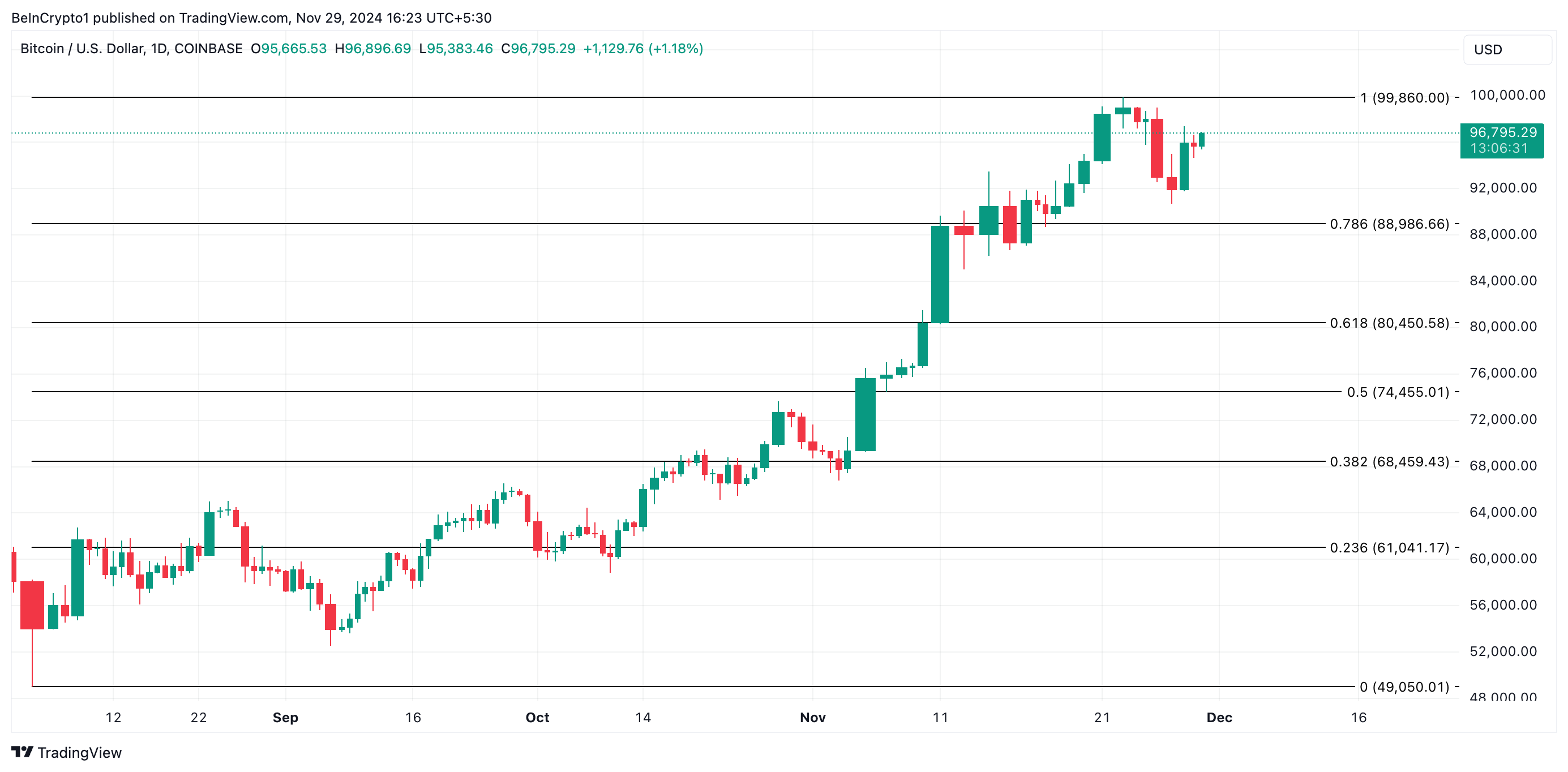 Bitcoin actualmente se negocia a 96,795 dólares. Para que las predicciones de 100,000 dólares se materialicen, BTC tiene que recuperar su máximo histórico de 99,588 dólares, que se ha convertido en un nivel de resistencia, y convertirlo en un piso de soporte. Si esto sucede, Bitcoin puede subir por encima de 100,000 dólares en diciembre.