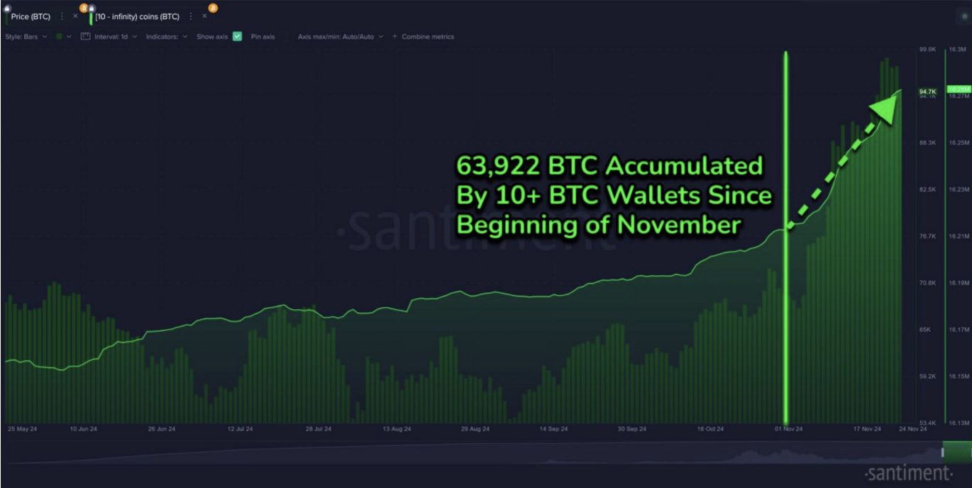 “Los principales holders de Bitcoin (monederos con 10+ BTC) han acumulado 63,922 BTC más solo en noviembre, por un valor de 6,06 mil millones de dólares. Incluso con el máximo alcanzado el viernes, no han disminuido su ritmo de acumulación en absoluto. Esto debería considerarse una señal positiva de que esta leve caída es simplemente un mini retroceso diseñado para sacudir a las manos más débiles y a los traders que compraron a 98K/99K dólares,” dijo Quinlivan.