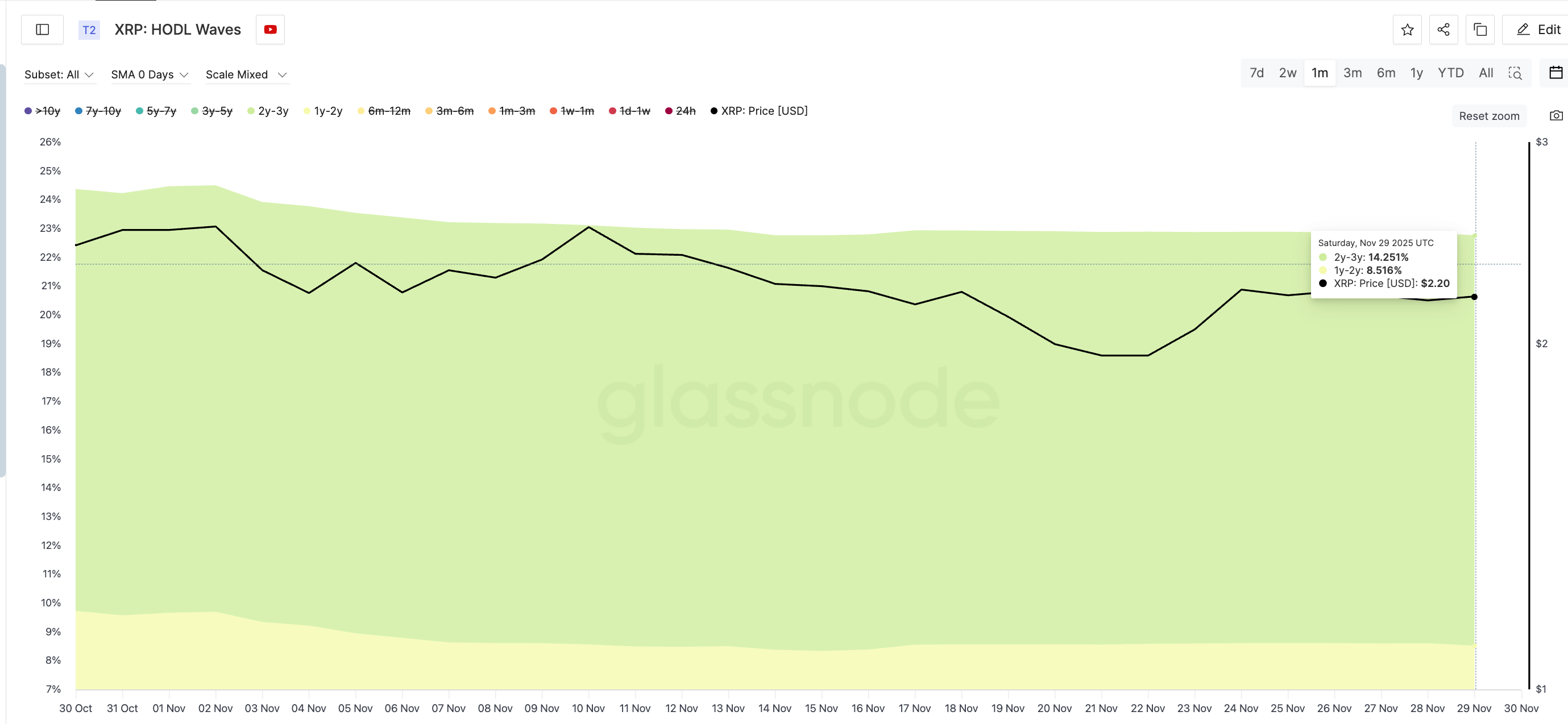 Las métricas on-chain ofrecen un panorama más conservador. Los holders a largo plazo, especialmente los que han mantenido XRP entre uno y tres años, han reducido sus saldos en las últimas semanas.