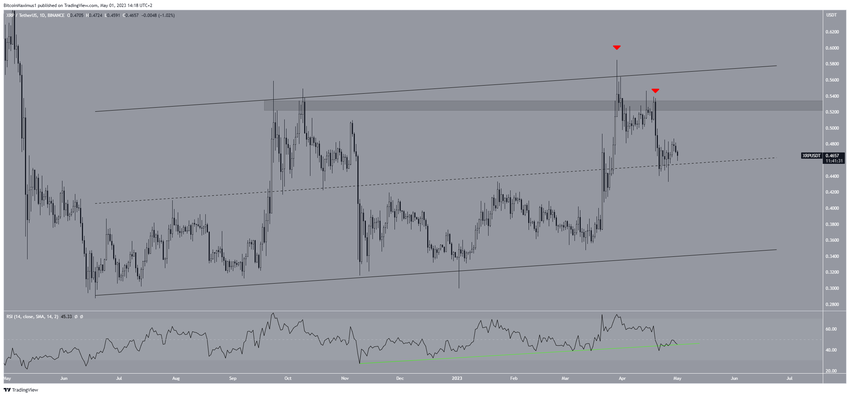 El precio de XRP ha caído desde que la línea de resistencia del canal lo rechazó el 29 de marzo. Una ruptura de la línea media del canal pondrá en riesgo toda la estructura alcista y el movimiento alcista anterior.