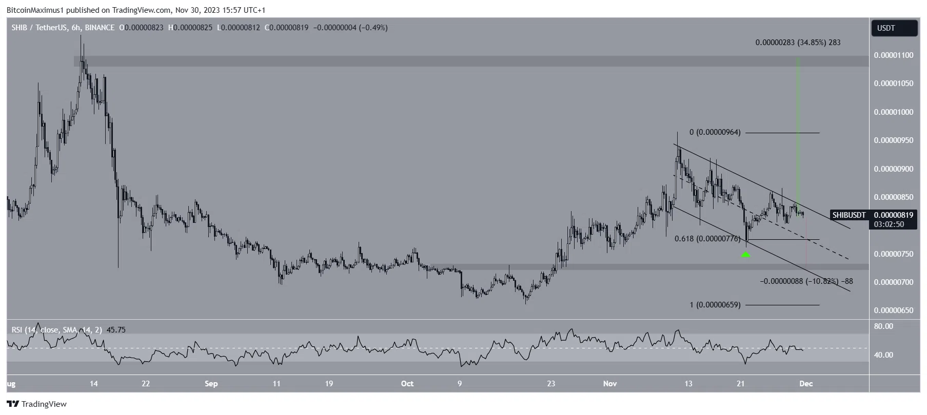 El marco de tiempo de seis horas da una lectura similar mixta. El precio de SHIB ha caído dentro de un canal paralelo descendente desde el 11 de noviembre, un patrón típicamente asociado con movimientos correctivos.