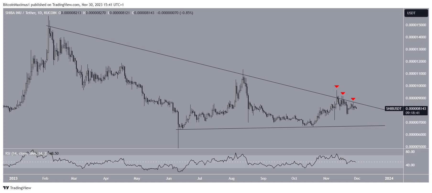 Tras el último rechazo del 27 de noviembre, el precio de SHIB ha experimentado una nueva caída. Desde junio, existe una línea de tendencia de soporte ascendente, que establece un triángulo simétrico cuando se combina con la resistencia anterior.