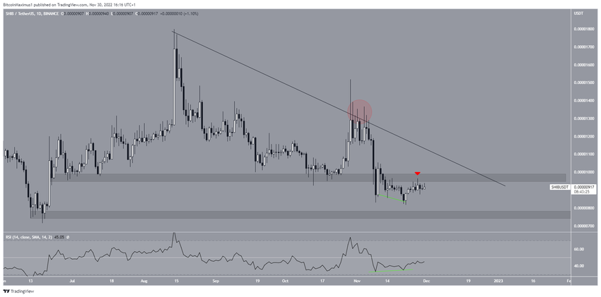 El precio del token Shiba Inu cayó por debajo de una línea de resistencia descendente desde el 14 de agosto. La línea rechazó la criptomoneda meme varias veces entre el 28 de octubre y el 4 de noviembre (círculo rojo). Posteriormente, siguió una fuerte caída, lo que provocó una ruptura del área horizontal a largo plazo de 0.0000097 dólares y un precio mínimo de 0.0000081 dólares. El área ahora proporcionará resistencia.
