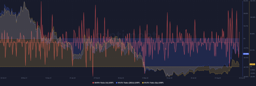 Curiosamente, el MVRV a corto plazo de XRP (1 día) notó un fuerte aumento, mientras que la relación MVRV (365 días) y la relación MVRV (5 años) notaron una caída.