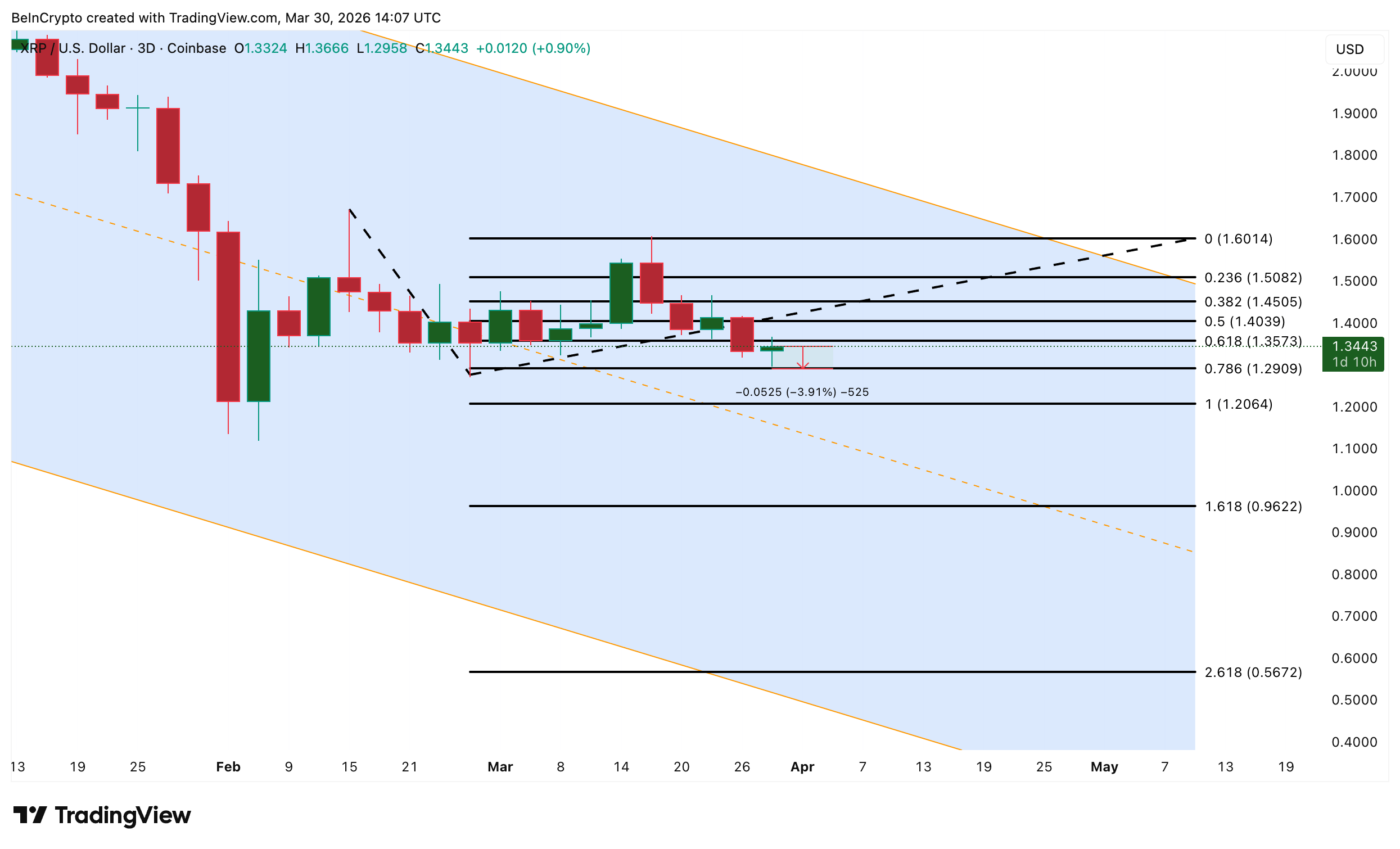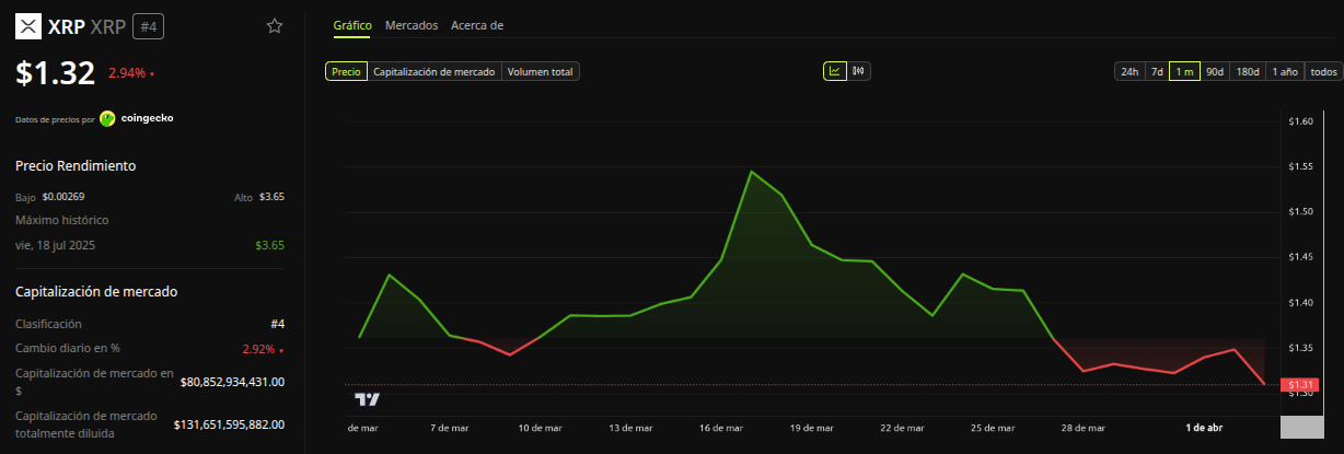 XRP entró en abril de 2026 dentro de un canal descendente que ha dominado su comportamiento desde julio de 2025. Marzo cerró con una caída del 2.79%, extendiendo una racha negativa de seis meses y reflejando una tendencia debilitada frente a otros ciclos.
