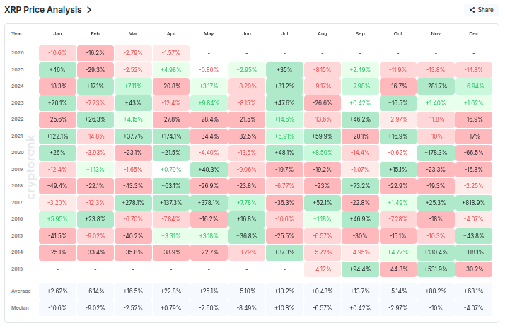 - XRP entra en abril con un equilibrio delicado entre datos históricos positivos y señales actuales de debilidad.