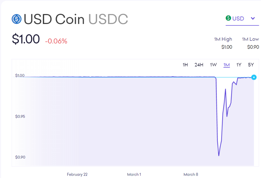 USDC perdió su paridad con el dólar estadounidense en medio de mil millones de dólares en rescates después de que la Corporación Federal de Seguros de Depósitos tomó el control del banco el viernes 10 de marzo de 2023. Circle luego tuiteó que los intentos de retirar 3 mil millones de dólares del banco habían fallado.