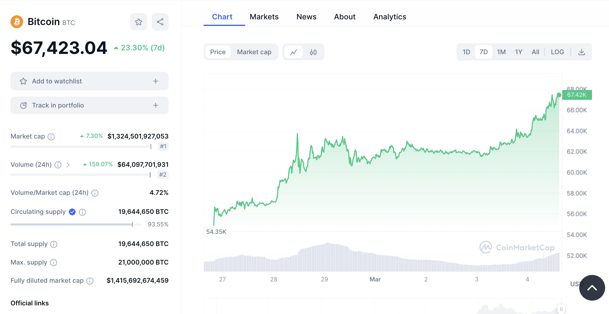 Al 04 de marzo, el precio de Bitcoin rondaba los 67,419 dólares, en la antesala de los 69,000 dólares alcanzados en noviembre de 2021. Por día, BTC tiene alzas superiores a 7% y en la última semana ha subido 24,32%. Además, su capitalización de mercado asciende a 1,32 billones de dólares, de acuerdo con CoinMarketCap.