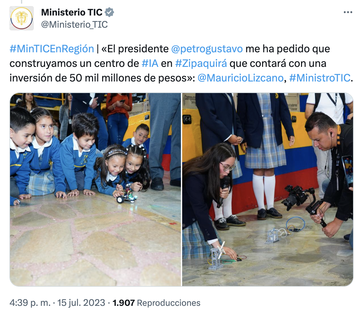 Según el ministro de las Tecnologías de la Información y las Comunicaciones (TIC), Mauricio Lizcano, en 2023 se realizarán los estudios y el diseño del centro de Inteligencia Artificial. La idea es que el proyecto abra sus puertas en Zipaquirá para 2024.