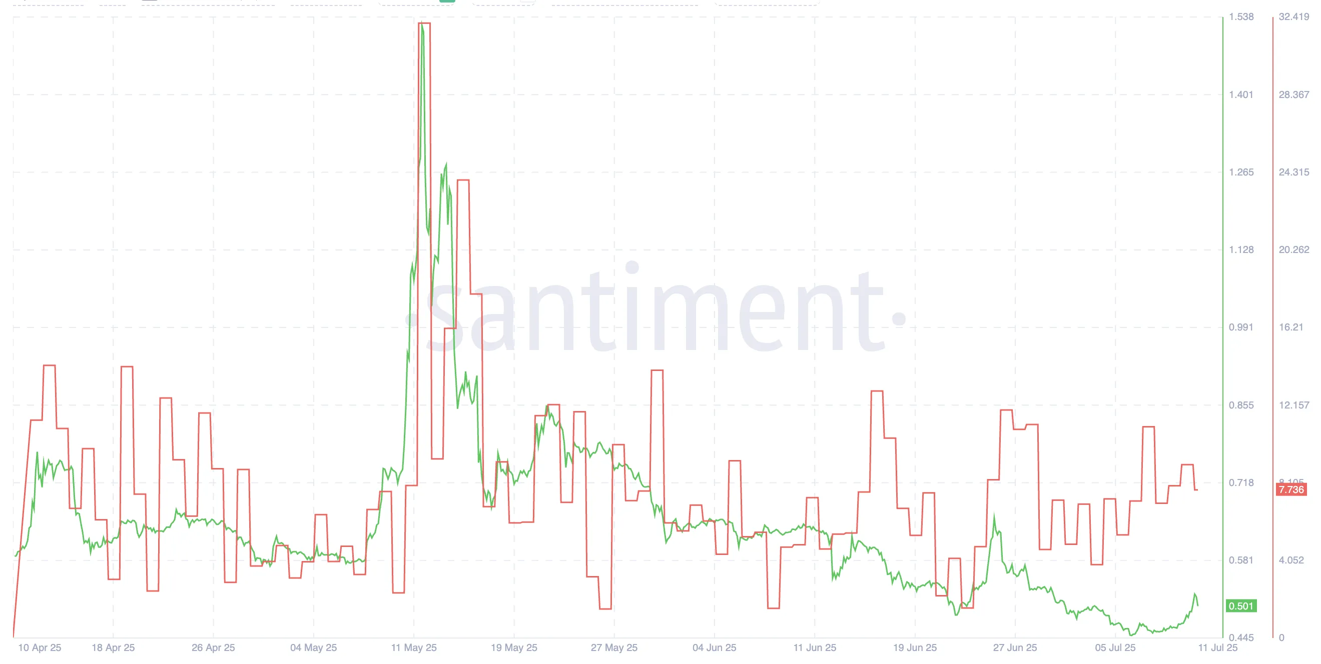 SponsoredLo que destaca esta vez es la desconexión: el precio no ha seguido con igual intensidad. Aunque PI saltó brevemente de 0,465 dólares a 0,51 dólares el 10 de julio, todavía está rondando cerca de una resistencia clave. Si el sentimiento se mantiene estable, como ha ocurrido en rallies pasados, una reacción de precio retrasada aún podría estar en juego.