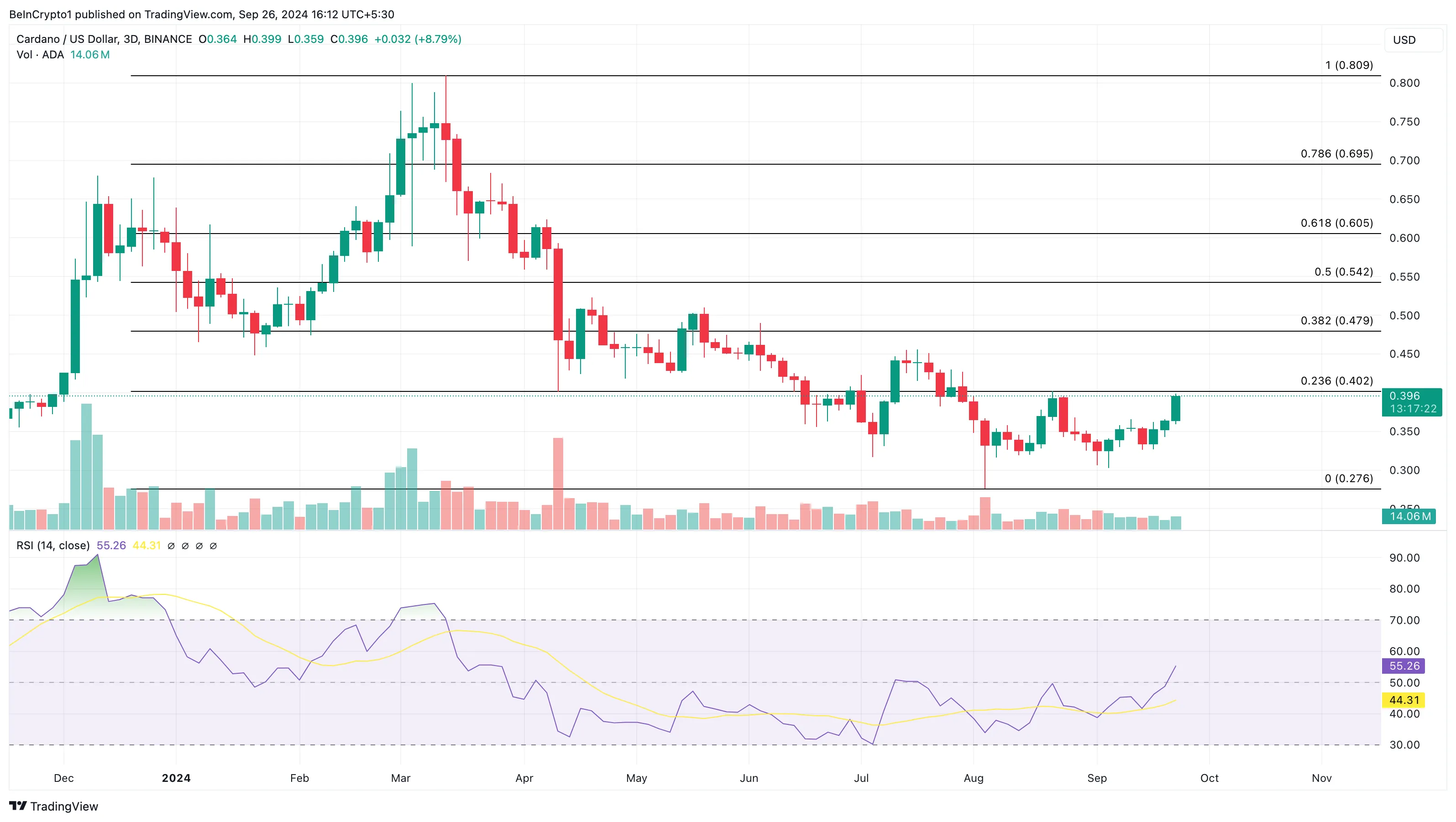 Una evaluación del gráfico de 3 días de ADA/USD parece alinearse con la perspectiva alcista. Basado en el gráfico, el Índice de Fuerza Relativa (RSI) ha subido por encima del punto medio neutral. Como indicador técnico, el RSI mide el momento utilizando la magnitud de los cambios de precio.
