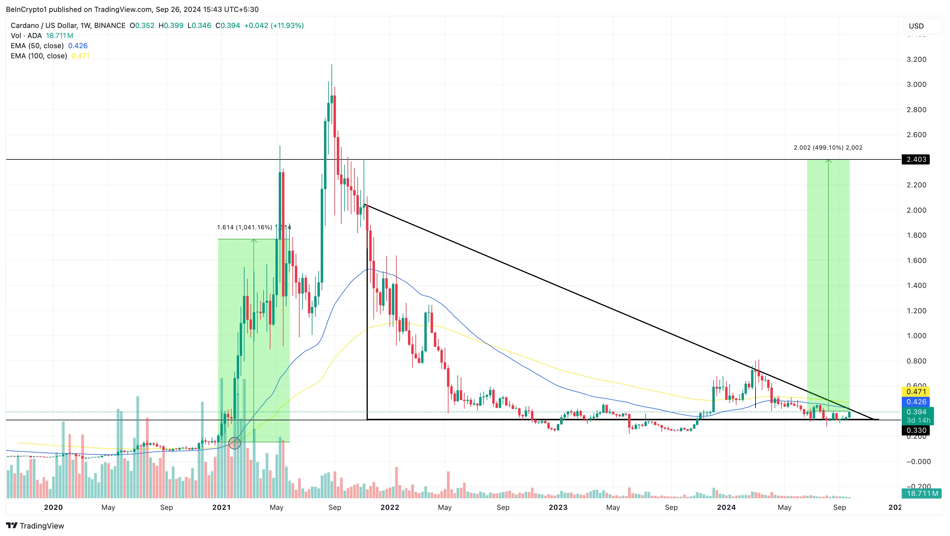 Curiosamente, el precio actual de Cardano de 0,39 dólares y su alineación de EMA parecen reflejar la configuración antes de su anterior carrera alcista, sugiriendo que una ruptura de un triángulo descendente podría estar en el horizonte. Por lo tanto, si el precio sale del canal descendente, el precio de Cardano podría repetir el rendimiento pasado, escalando 500% en los próximos seis meses.