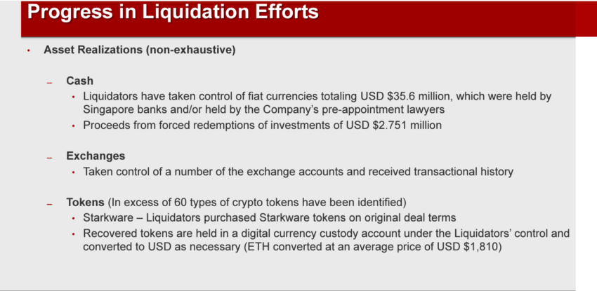 Los liquidadores dijeron a los tribunales el 2 de diciembre de 2022 que habían incautado más de 35 millones de dólares de las cuentas bancarias de Three Arrows en Singapur y otras fichas cripto, incluidas las fichas no fungibles .