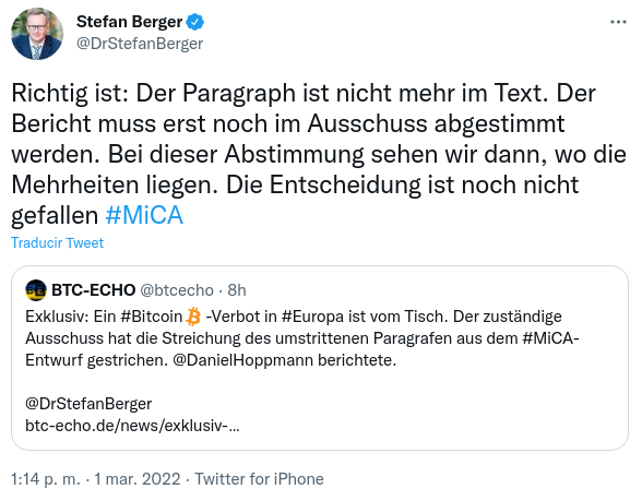 Posteriormente, Stefan Berger, miembro de la oficina adjunta del presidente del comité responsable de economía y moneda (ECON), confirmó que la prohibición de Bitcoin en Europa estaría fuera de discusión, debido a que el comité responsable suprimió el polémico párrafo del borrador del MiCA: