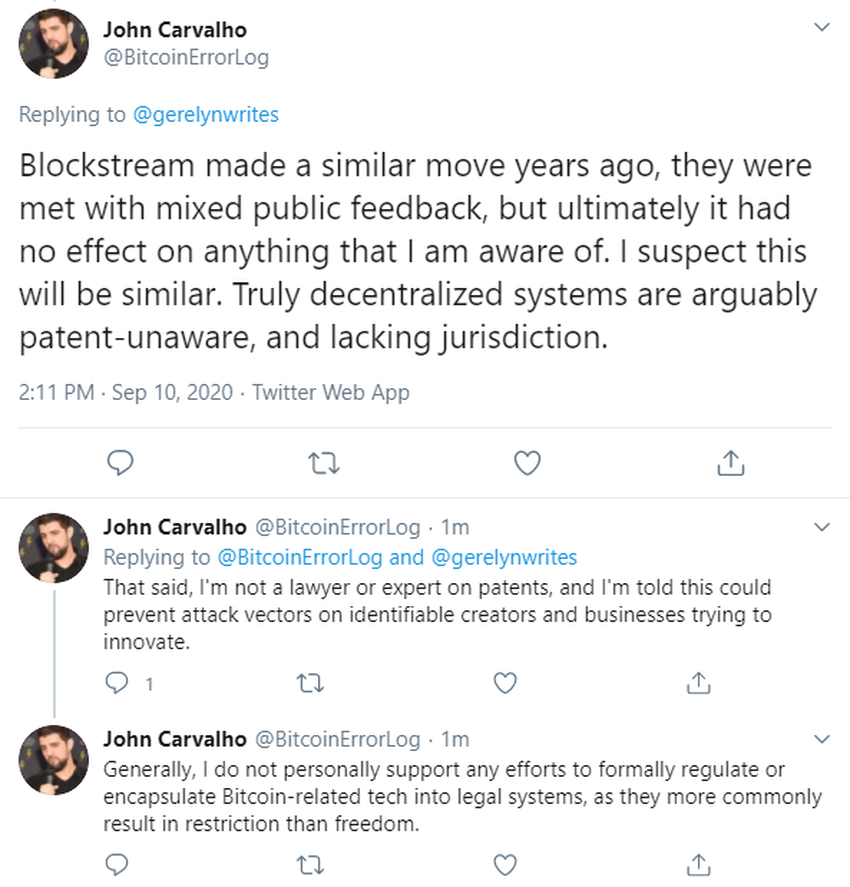 BeInCrypto se puso en contacto con Jack Dorsey para pedirle un comentario, pero no recibimos respuesta (actualizaremos esta historia si eso cambia.) También escribimos a John Carvalho, cuya cuenta de Twitter lo describe como un forajido de GitHub. Carvalho nos proporcionó algo de contexto sobre la nueva biblioteca de patentes de Square Crypto, comparándola con un movimiento similar de Blockstream en 2016. En ese momento, la compañía adoptó lo que describió como una “estrategia de patentes defensiva”, una cuya misión se asemeja a la de Square Crypto.