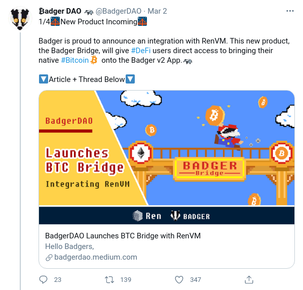 “Badger Bridge, impulsado por RenVM, funciona como una puerta para la transferencia de BTC a otras cadenas, lleva a cabo la misión del programa Badger Cetedel y promueve el mandato principal de BadgerDAO”.