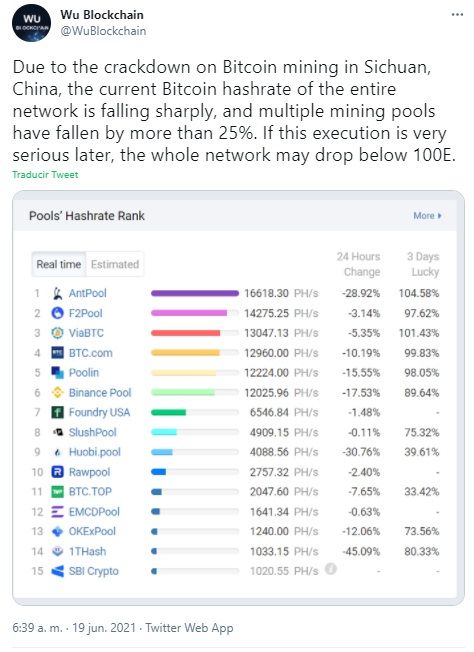 “Debido a la represión contra la minería de Bitcoin en Sichuan, China, el hashrate actual de Bitcoin de toda la red está cayendo drásticamente, y varios pools de minería se han desplomado en más del 25%. Si esta ejecución es muy grave más adelante, toda la red puede caer por debajo de 100E”.