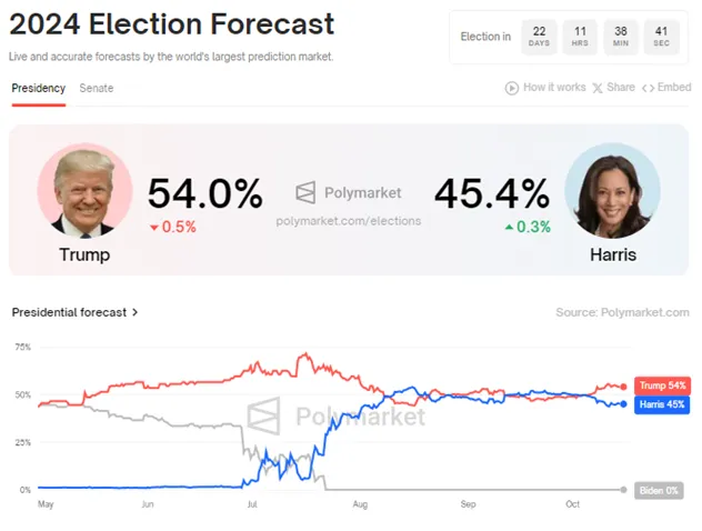 Los datos de Polymarket indican que Donald Trump lidera con 54% de apoyo, comparado con el 45,4% de Kamala Harris, con solo 22 días restantes antes de las elecciones en Estados Unidos. Trump también está adelante en estados clave indecisos, incluyendo Arizona, Georgia, Pensilvania, Michigan y Wisconsin.