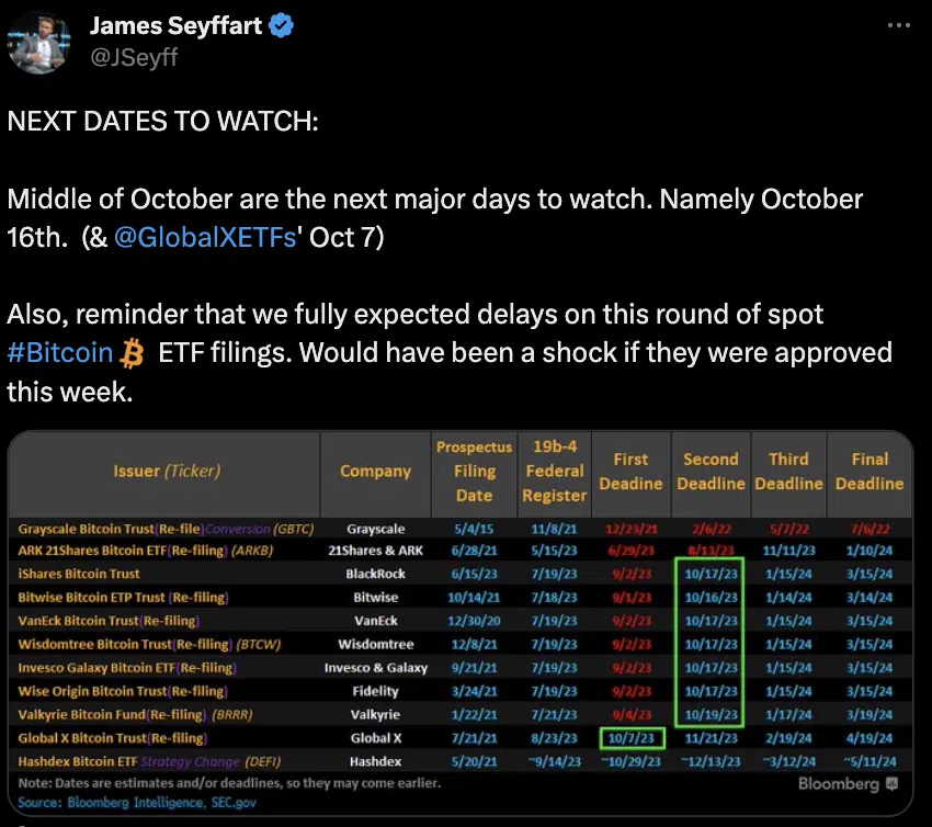 La próxima fecha límite para aprobar solicitudes de ETF de Bitcoin al contado es del 17 al 19 de octubre.