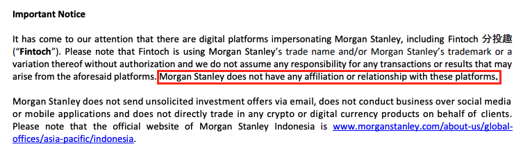 Además, para legitimar el proyecto afirmaban ser propiedad de Morgan Stanley, llegando a auto referirse como “Morgan DF Fintoch”. Sin embargo, Morgan Stanley negó categóricamente la asociación con dicha empresa en un comunicado.