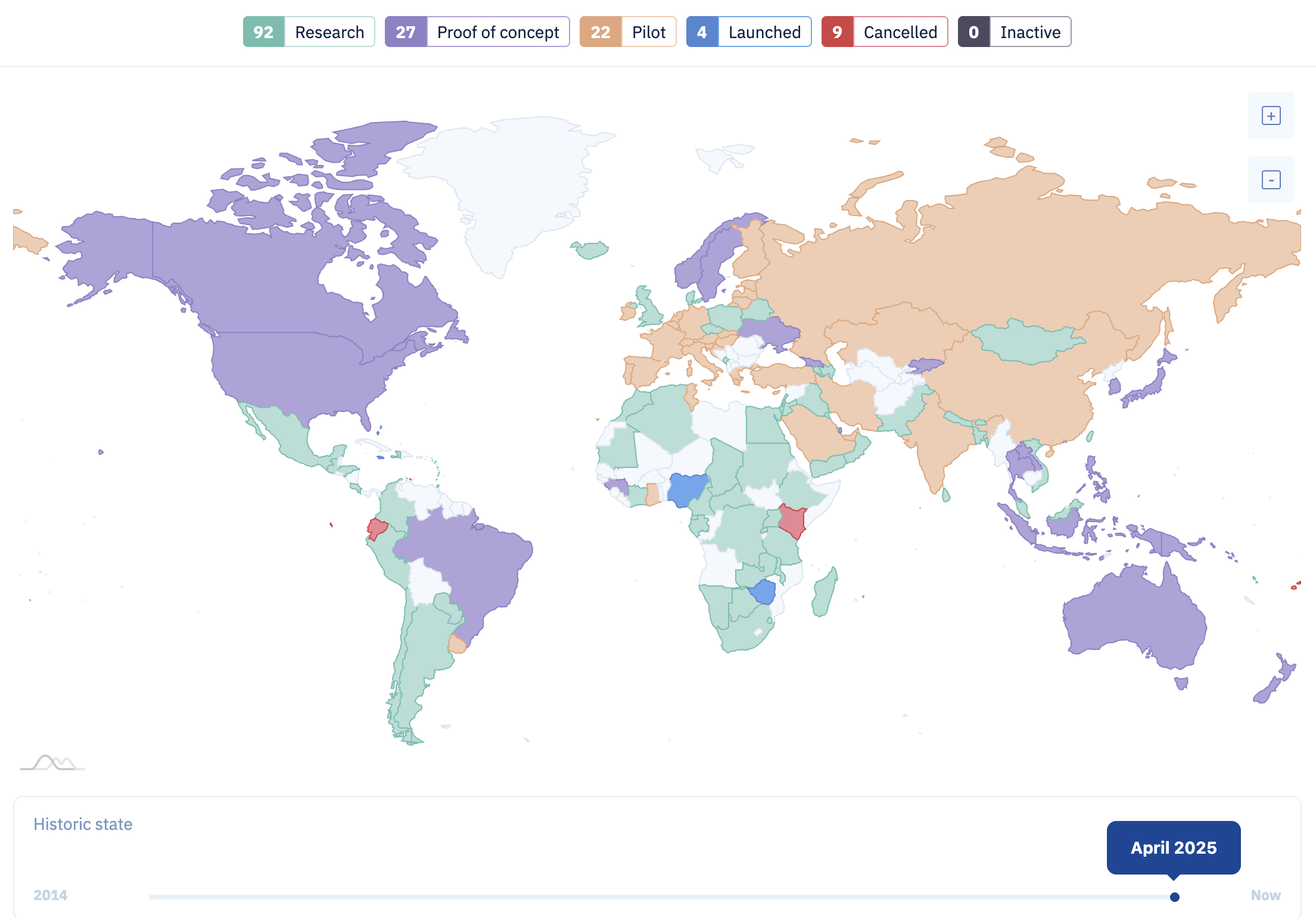 Entre estos, 92 están en la fase de investigación, 27 están trabajando en pruebas de concepto, y 22 están llevando a cabo programas piloto. Además, cuatro países han lanzado oficialmente sus CBDC. Por último, solo nueve proyectos han sido cancelados.