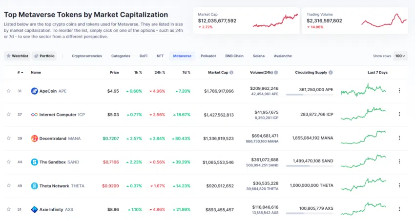 Varios estudios han proyectado que el tamaño del mercado del metaverso alcanzará 1 billón de dólares para 2030 si se produce una adopción masiva. En la actualidad, la capitalización de mercado de los tokens del metaverso, según CoinMarketCap, es de alrededor de 12,100 millones de dólares.