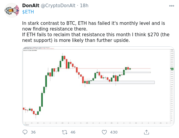 Por debajo de eso hay un largo descenso a 320 dólares y si los bajistas realmente comienzan a destrozar los mercados, la predicción de “DonAlt” de una caída a 270 dólares podría estar en las cartas.