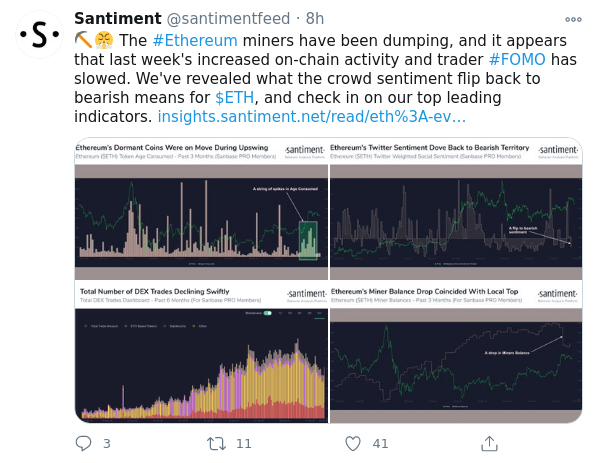 SponsoredLa investigación ha observado que los mineros de Ethereum han vendiendo en masa y por ello el sentimiento trader ha disminuido recientemente.