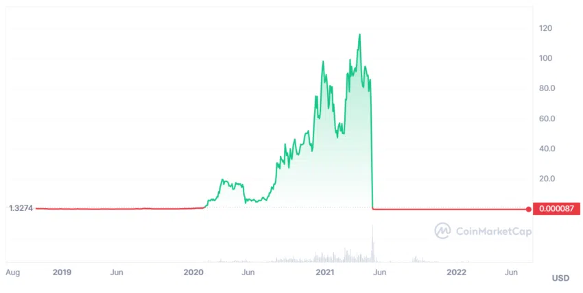 Terraform Labs fue la primera y posiblemente la implosión más importante de 2022. Su proyecto insignia, la stablecoin Terra (UST) y su token hermano Luna (LUNA), colapsaron espectacularmente en la primavera de ese año.