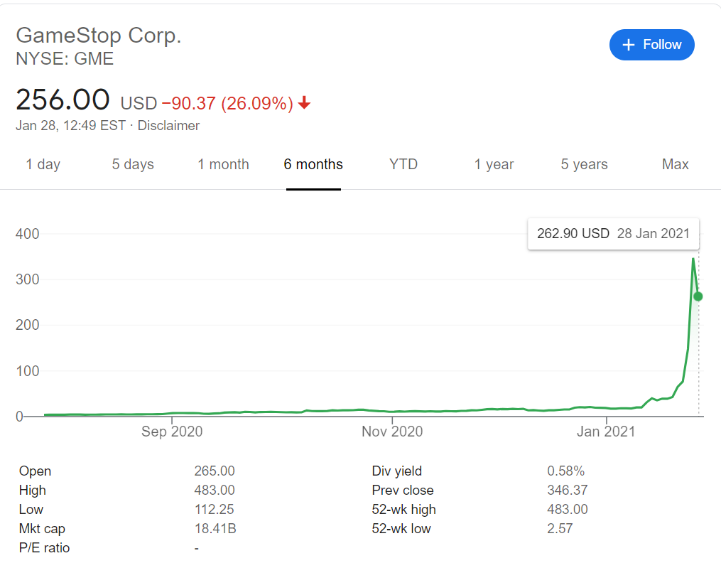 Al momento de redactar este artículo, la acción de GameStop se encuentra nuevamente en declive llegando a caer hasta los $250 después de haber alcanzado un tope de $469 y corregir hasta los $112 durante el transcurso del día.