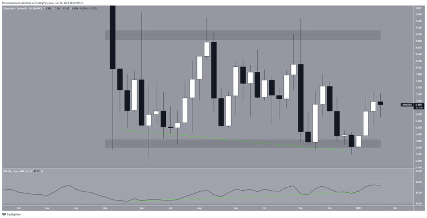 Desde mayo de 2022, el precio de Chainlink se ha negociado por encima del área de soporte horizontal de 5.75 dólares. Si bien alcanzó un precio mínimo de 5.30 dólares, el precio de LINK logró mantenerse por encima del área de soporte de 5.75 dólares en el marco de tiempo semanal.
