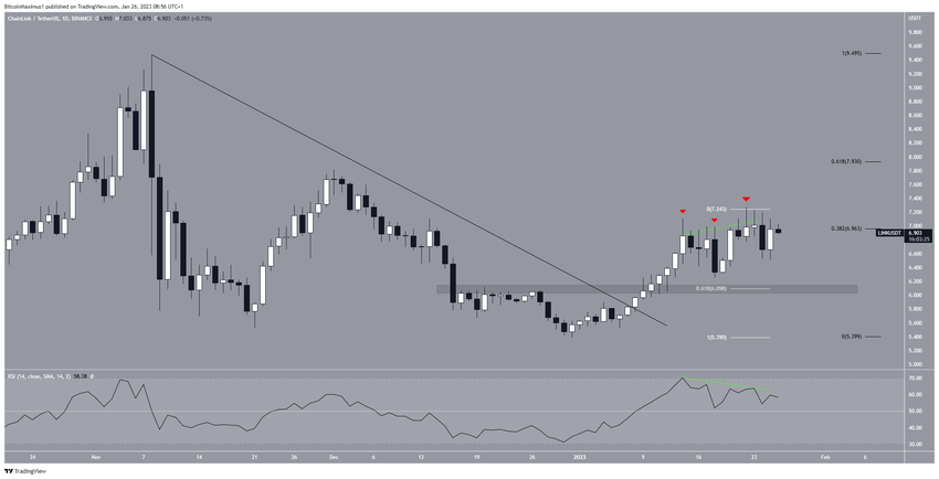 Actualmente, LINK está intentando salir del nivel de resistencia de retroceso de Fibonacci de 0.382 a 6.96 dólares. Hasta el momento, ha realizado tres intentos fallidos de hacerlo (iconos rojos), que se han combinado con una divergencia bajista en el RSI (línea verde).
